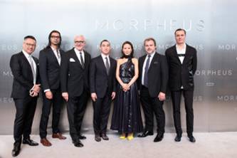 新濠天地第三期发展项目焦点摩珀斯酒店的梦幻团队。左至右起:香港时装设计师郑兆良、“杜卡斯餐厅”和“风雅厨” 之室内设计师Sanjit Manku、殿堂级名厨杜卡斯(Alain Ducasse)、新濠博亚娱乐主席兼行政总裁何猷龙先生及夫人罗秀茵女士、甜点大师皮埃尔•艾尔梅(Pierre Hermé)、扎哈‧哈迪德建筑师事务所(Zaha Hadid Architects)总监Patrik Schumacher。